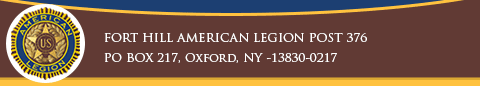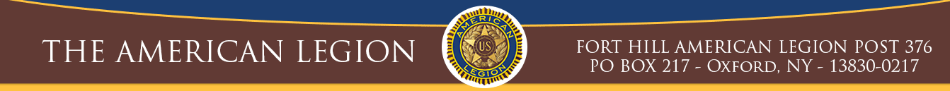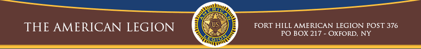 Today, the Oxford American Legion Fort Hill Post #376 is part of the nation's largest veterans service organization. They are a member of the Chenango County American Legion, under the Department of New York. They are committed to mentoring and sponsorship of Oxford youth, community service in Oxford, upholding patriotism and honor, promoting a strong national security, and the continuation of the care of veterans. Please peruse our website and learn about our Post, how we fufill the mission, and how you can join the Fort Hill American Legion Post 376 of Oxford, NY.